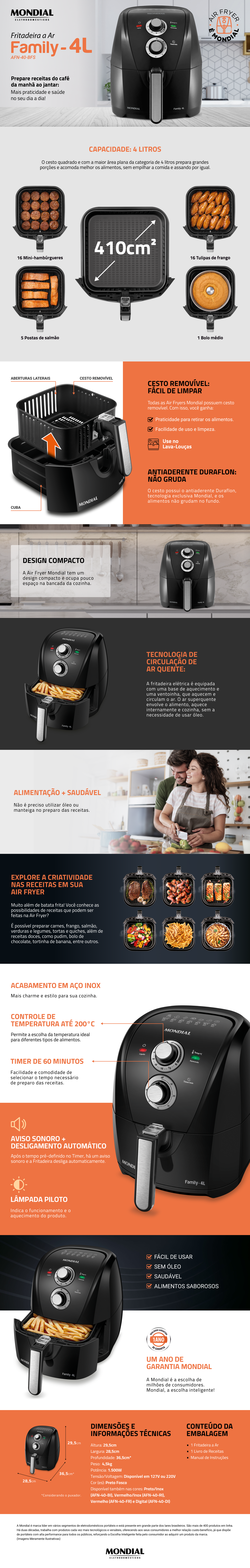 Prepare receitas do café da manhã ao jantar com a Air Fryer Mondial AFN-40-FB. Ela combina praticidade, rapidez e saúde, oferecendo refeições deliciosas sem a necessidade de óleo ou manteiga. Sua Tecnologia de Circulação de Ar Quente permite assar, fritar, cozinhar e tostar alimentos com alta eficiência, proporcionando uma alimentação saudável e saborosa.