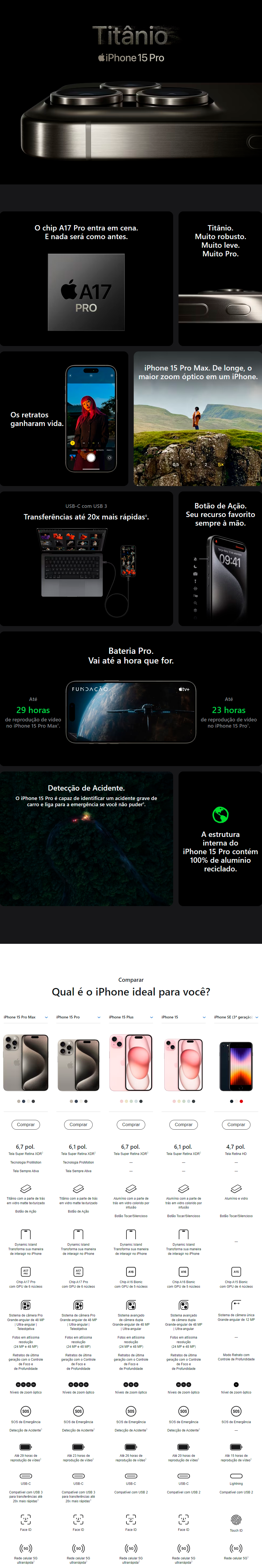 | Outros Recursos | Dynamic Island, Tela Sempre Ativa, HDR10, Dolby Vision |