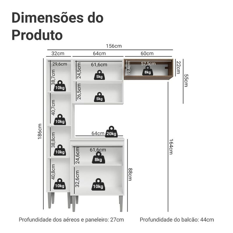 - 44 cm de profundidade nos balcões e 27cm nos aéreos/paneleiro