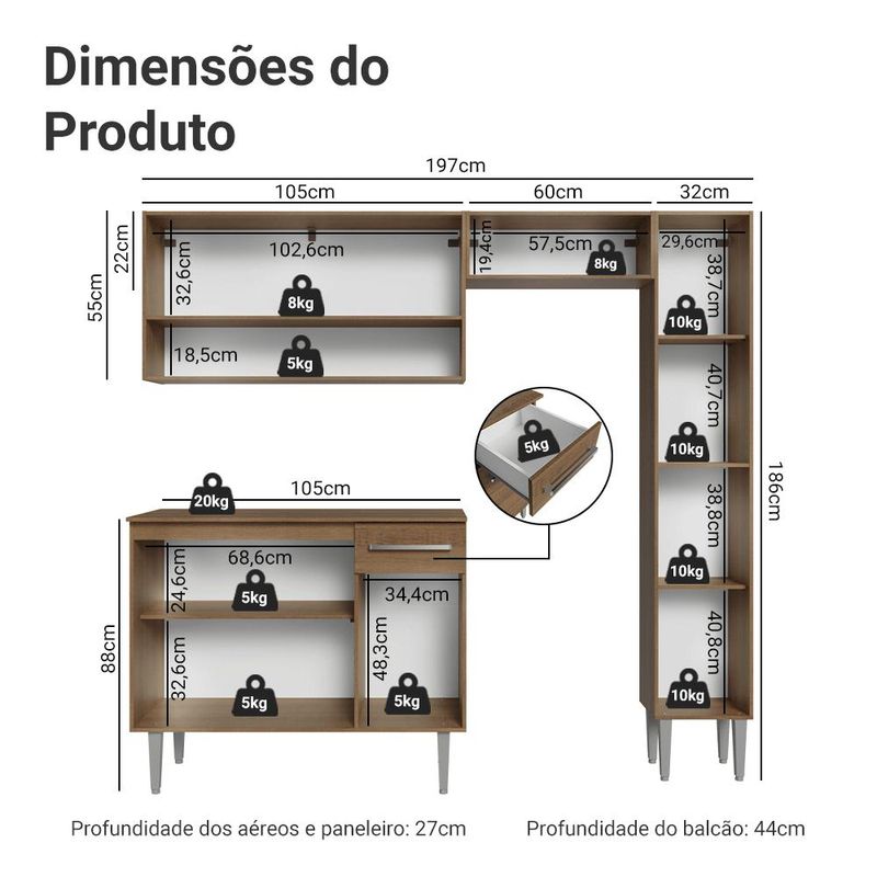 - 44 cm de profundidade nos balcões e 27cm nos aéreos/paneleiro