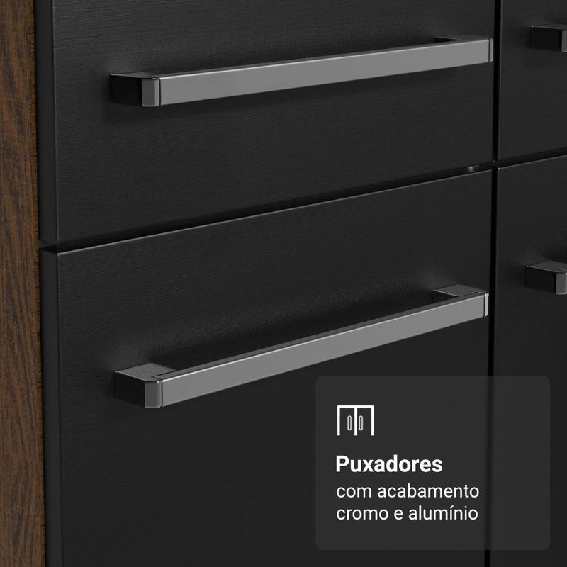 A linha Emilly se destaca pelo acabamento de alta resistência, puxadores em alumínio, corrediças e dobradiças metálicas, garantindo durabilidade no uso diário. Os pés reguláveis proporcionam estabilidade e facilitam a limpeza. O acabamento em tom amadeirado Rustic e Preto dá um toque elegante e moderno à sua cozinha.