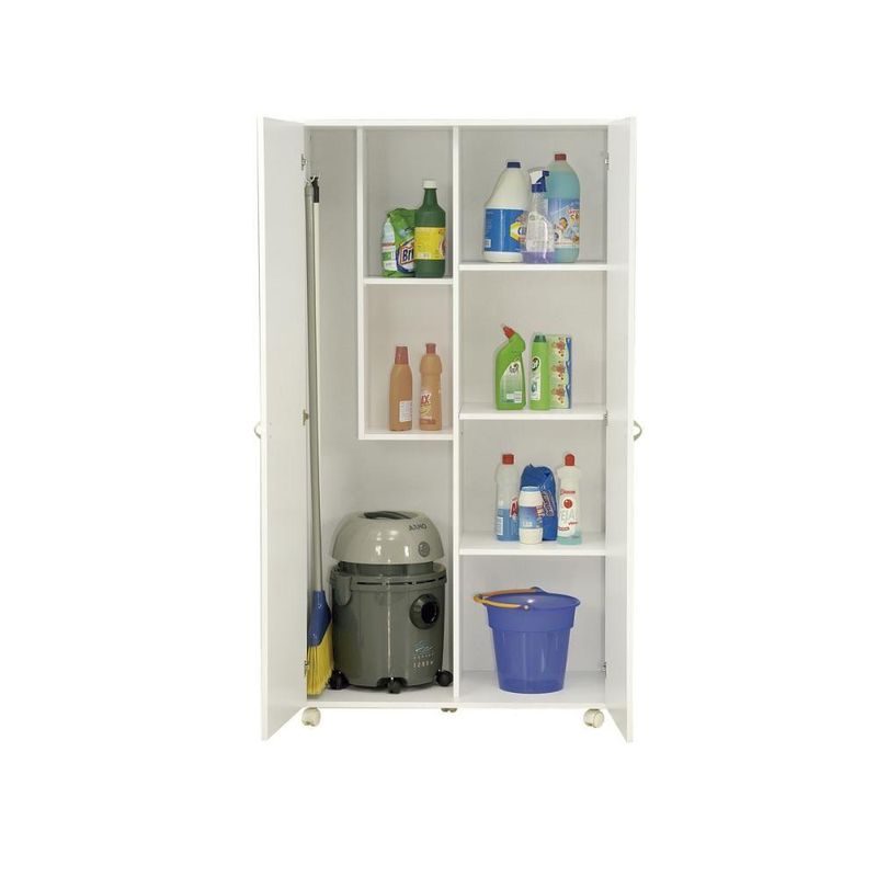 O Armário possui duas portas e diversas prateleiras que podem suportar até 15kg, possui ainda cabide para utensílios domesticos, além de espaço específico para acomodar eletromésticos de médio porte. Para facilitar o deslocamento do móvel, o Armário possui rodizios. Produto produzido em MDP 15mm e revestido em BP.