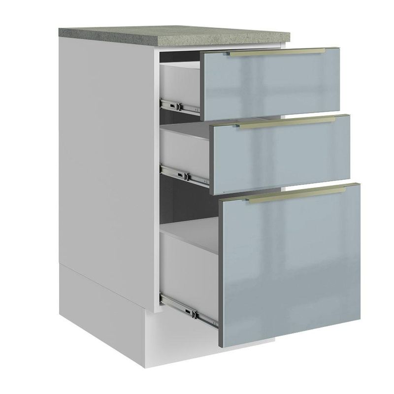 O balcão possui três gavetas grandes, sendo a última mais profunda, todas com puxadores em alumínio e corrediças telescópicas que possibilitam a abertura total.