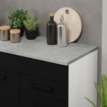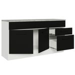 O acabamento da estrutura é branco e o das portas e frentes é preto. É feito em Pintura Poliéster com 7 camadas que protegem o móvel dos efeitos do álcool da água e do calor.