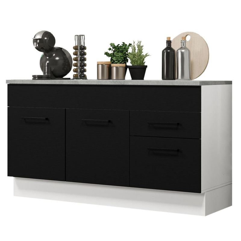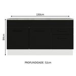 O móvel ainda acompanha tampo em MDP, que pode ser removido para a colocação de pia de inox ou pedra no tamanho de 150 cm de largura x 52 cm de profundidade.
