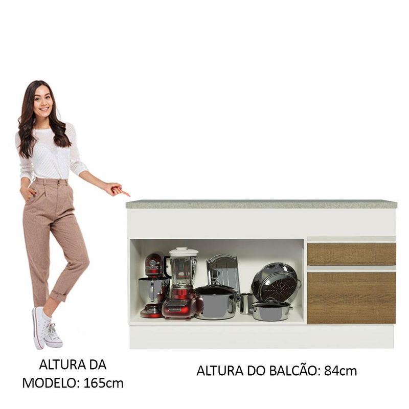 É desenvolvido com materiais de alta qualidade, como puxadores em alumínio e dobradiças metálicas com amortecimento. Conta com duas portas e duas gavetas com corrediças telescópicas, sendo uma delas maior. Por seu ótimo tamanho, permite organizar panelas, utensílios, louças, talheres, eletroportáteis e o que mais você necessitar.