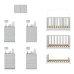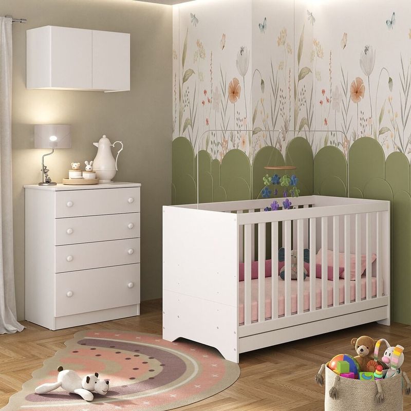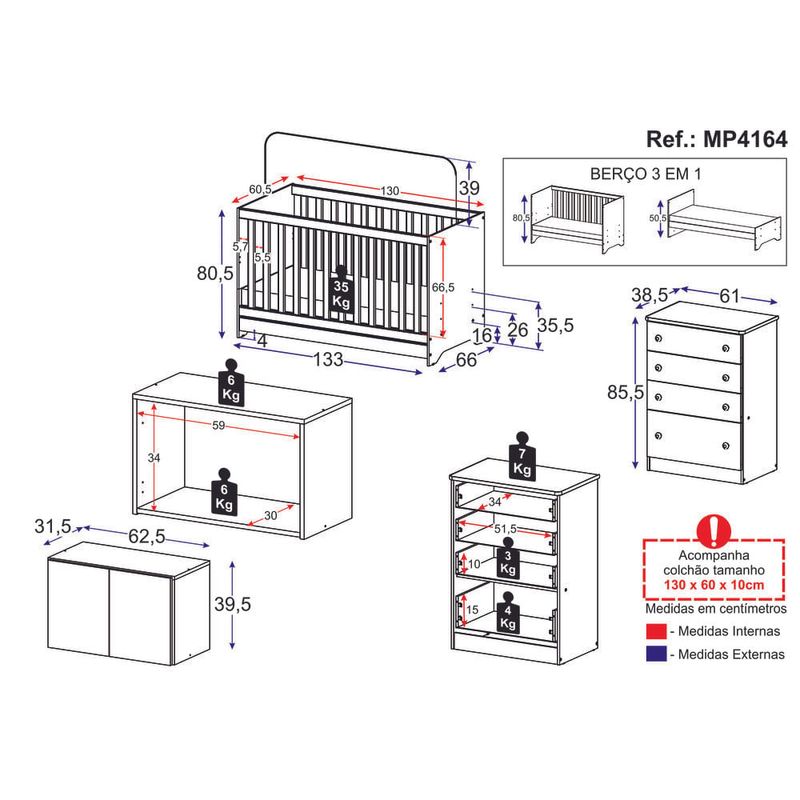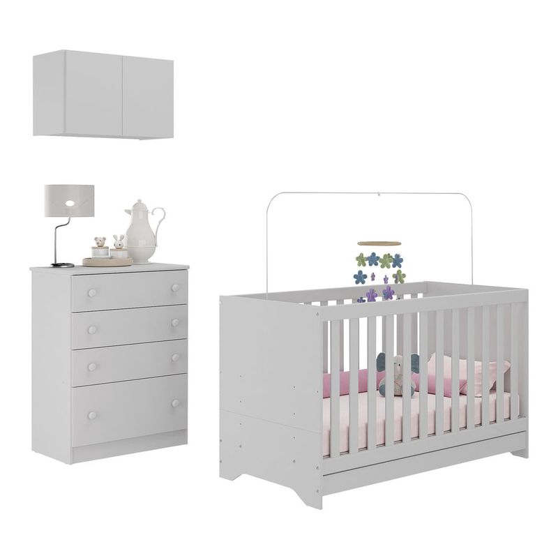 O Berço 3 em 1 com Colchão Armário Aéreo e Cômoda Multimóveis MP4164 é perfeito para tornar o quarto do bebê estiloso e funcional. Produzido em MDP com acabamento acetinado (cerca de 20% de brilho), garante durabilidade e resistência. O berço se transforma em sofá e minicama, acompanhando o crescimento do seu filho, possui 3 regulagens de altura para o colchão e acompanha suporte para mosquiteiro, garantindo noites mais tranquilas de sono para o bebê. A grade Soft (PVC) é produzida de maneira ecologicamente correta, com matéria-prima livre de metais pesados, atóxica e com proteção anti-amarelamento. Berço certificado pelo INMETRO sob o selo n° 0000085/2018. O colchão possui estrutura em espuma e tecido poliéster e um dos lados é impermeável. De conforto macio, possui tratamento anti-ácaro e anti-alérgico e é indicado para até 50kg. A cômoda conta com 4 gavetas espaçosas equipadas com corrediças metálicas (oferecem leveza no manuseio), sistema anti-tombamento, puxadores em ABS e acompanha detalhes em 4 cores (Branco, Rosa, Azul e Cinza), permitindo que você escolha qual combina mais com sua decoração na hora da montagem. O armário aéreo possui 2 portas e suporta até 6kg em seu interior.