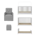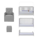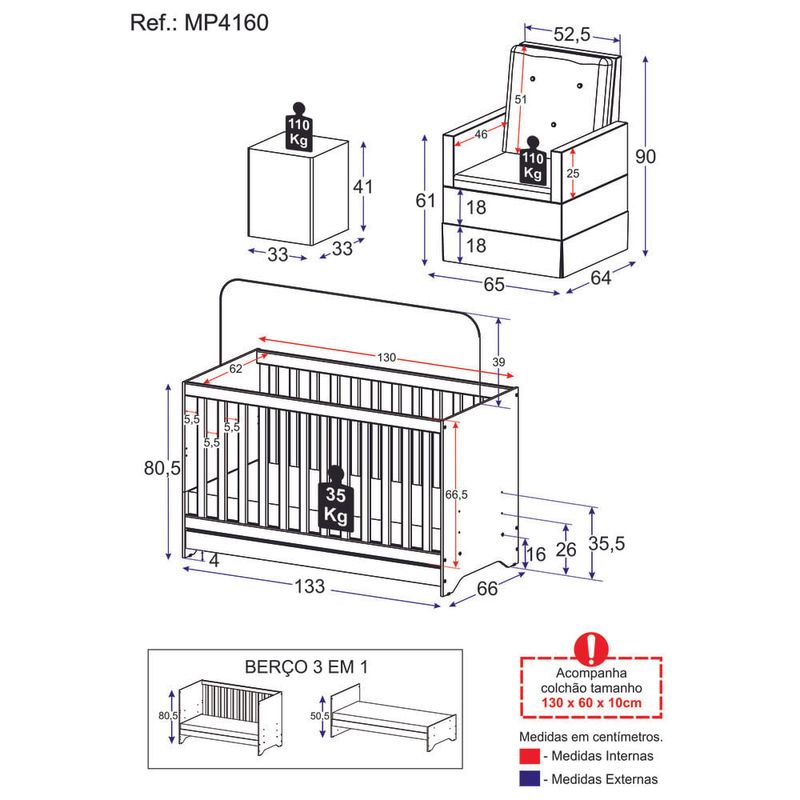 O Berço 3 em 1 com Colchão Poltrona Amamentação e Puff Multimóveis MP4160 é perfeito para proporcionar conforto ao seu pequeno. O berço é produzido em MDP com acabamento acetinado (cerca de 20% de brilho), garantindo durabilidade e resistência. Ele se transforma em sofá e minicama, acompanhando o crescimento do seu filho, possui 3 regulagens de altura para o colchão e acompanha suporte para mosquiteiro, garantindo noites mais tranquilas de sono para o bebê. A grade Soft (PVC) é produzida de maneira ecologicamente correta, com matéria-prima livre de metais pesados, atóxica e com proteção anti-amarelamento. Berço certificado pelo INMETRO sob o selo n° 0000085/2018. O colchão possui estrutura em espuma e tecido poliéster e um dos lados é impermeável. De conforto macio, possui tratamento anti-ácaro e anti-alérgico e é indicado para até 50kg. A poltrona de amamentação e o puff (suportam até 110kg) são produzidos em madeira de eucalipto, espuma densidade D23, molas reforçadas e mecanismo de balanço. As poltronas e puff nas cores cinza e bege possuem acabamento em tecido veludo. Poltrona e puff na cor branca possui acabamento em material sintético.