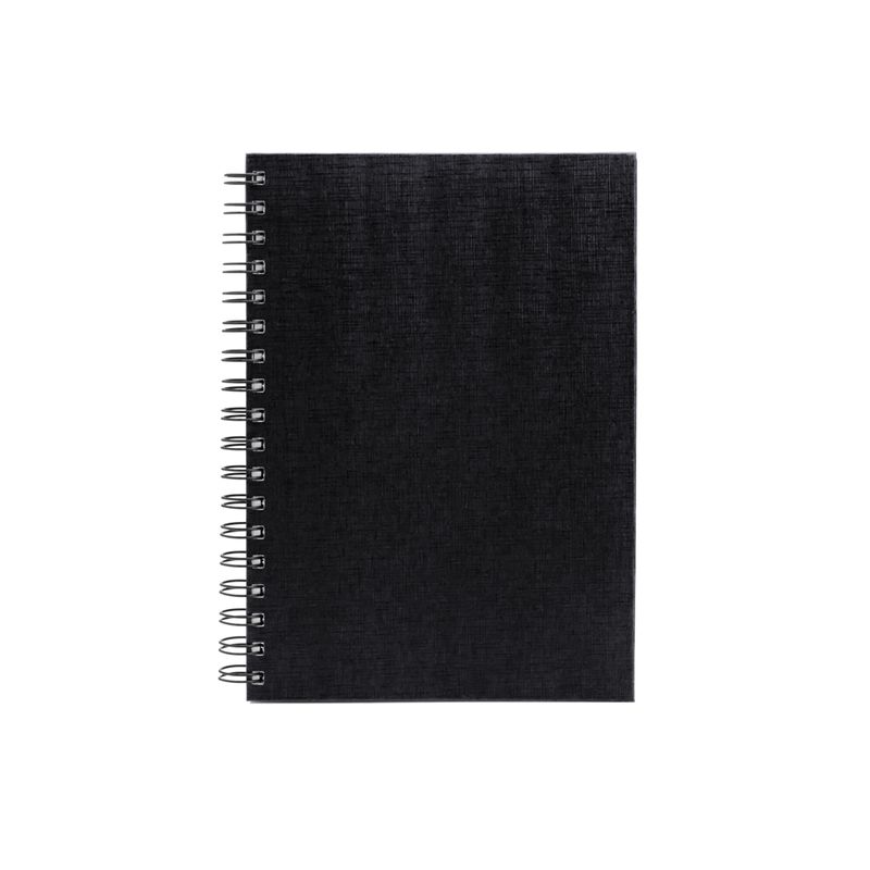 Caderno para anotações wire-o preto com capa dura revestida em percalux linho. Conta com folha para dados pessoais, calendário e 100 folhas pautadas. Gramatura da folha de 70 g/m2
