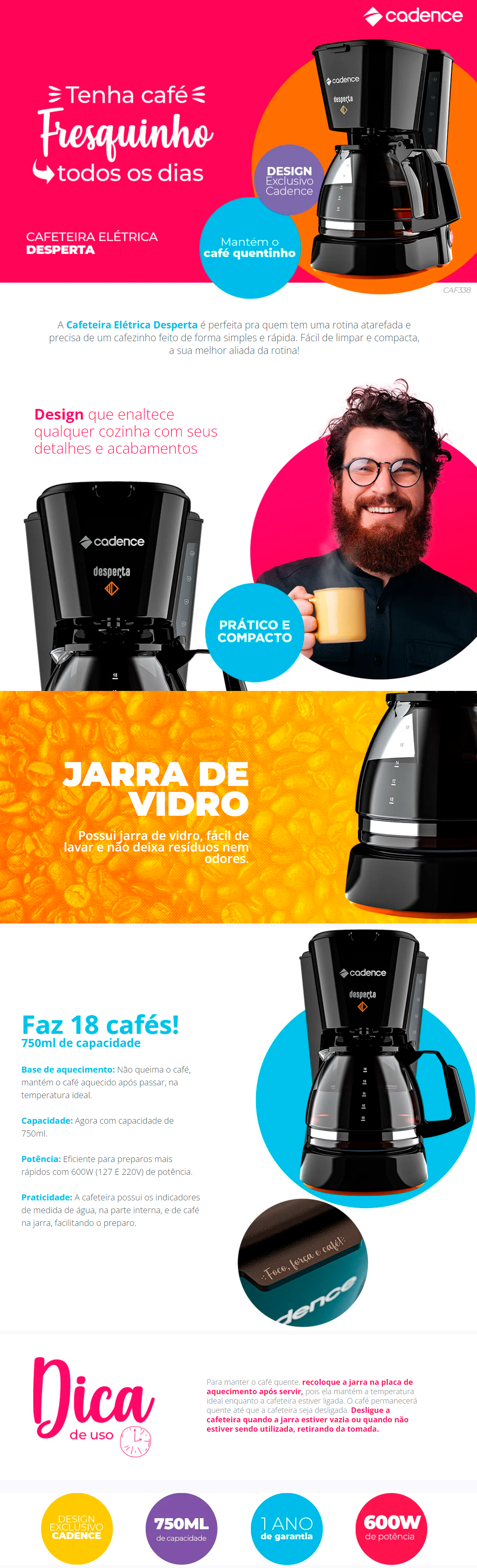 A cafeteira elétrica CAF338-220 combina design compacto e moderno com eficiência e praticidade. Ideal para uso doméstico, ela prepara café fresco e saboroso de forma rápida e econômica, graças à sua potência de 600W e baixo consumo de energia.