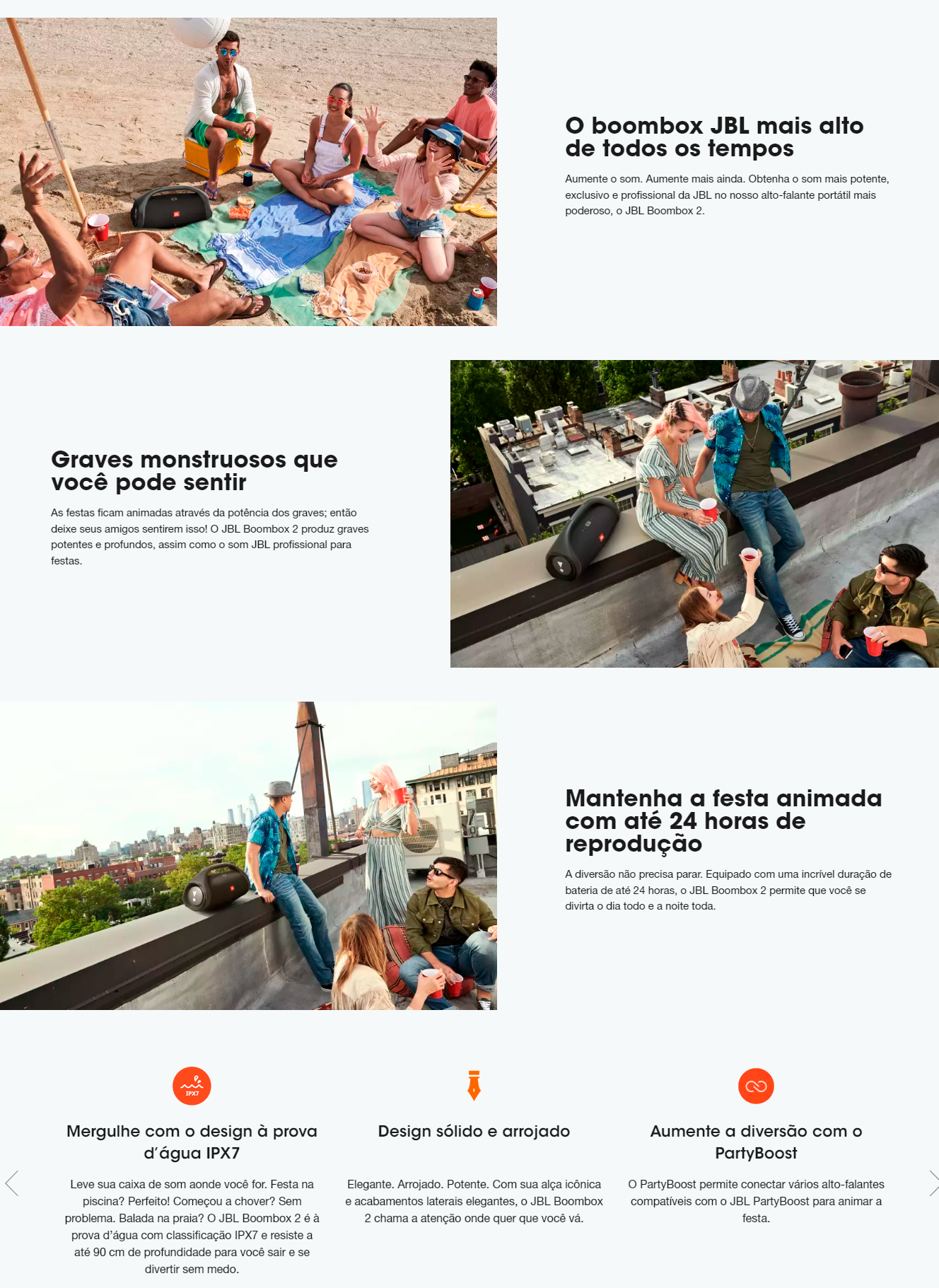 Versão do Bluetooth: 5.1 Tempo de reprodução de música (hrs): 24 Potência de Saída (W RMS): 2 x 40 W RMS-woofer + 2 x 40 W RMS-tweeter Resposta de Frequência Dinâmica: 50 Hz - 20 kHz Tipo de Bateria: Li-ion polymer 72.6 Wh Capacidade da bateria: Até 24 horas Tempo de carregamento: 6,5 horas Potência: 2x40W RMS (modo CA) 2x30W RMS (modo bateria) Conexões: Micro USB (para carregamento da bateria) P2 (3.5mm) e Bluetooth 5.1