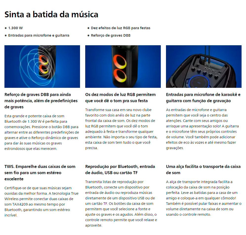 • Aprimoramento de som: Dynamic Bass Boost, controle de agudos e graves, Karaokê