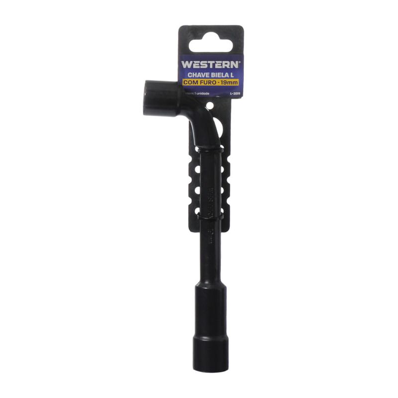 CHAVE BIELA L COM FURO 19MM - Dimensões da Peça: 21,5 x 5,5 x 2,5cm - Dimensões da Embalagem: 6,5 x 2,5 x 21cm - Quantidade Inner: 10 Peças - Dimensões Inner: 29 x 19 x 7cm - Quantidade Master: 40 Peças - Dimensões Master: 38 x 30 x 16cm - Material: Aço carbono - Cor: Preta - Tipo de Embalagem: Suporte com saco plástico - Marca: Western - Origem: China - Contém: 1 unidade - Medida: 19mm - Características: • Com design na cabeça que contém furo passante. • Fabricado em aço carbono com acabamento acetinado em preto. - Cuidados: • Utilize equipamento de proteção individual. (óculos de proteção, botas, etc.) Necessário ao trabalho. • Use a ferramenta correta para cada tipo de trabalho. Não force a ferramenta. A ferramenta correta fara o trabalho melhor e mais seguro se utilizada para aquilo que foi projetada. • Guarde em local seguro. • Manter fora do alcance das crianças. - Sac Fornecedor: • Sac: 0800 607 1322 • Email: posvendas@etilux.com.br • Site: www.etilux.com.br - Garantia: • Em condições normais de uso, este produto tem garantia de 90 dias contra defeitos de material e fabricação, mediante apresentação da nota fiscal de compra. Má conservação, manuseio inadequado, quedas ou quaisquer outras avarias produzidas pelo uso incorreto, a garantia oferecida perde a validade.