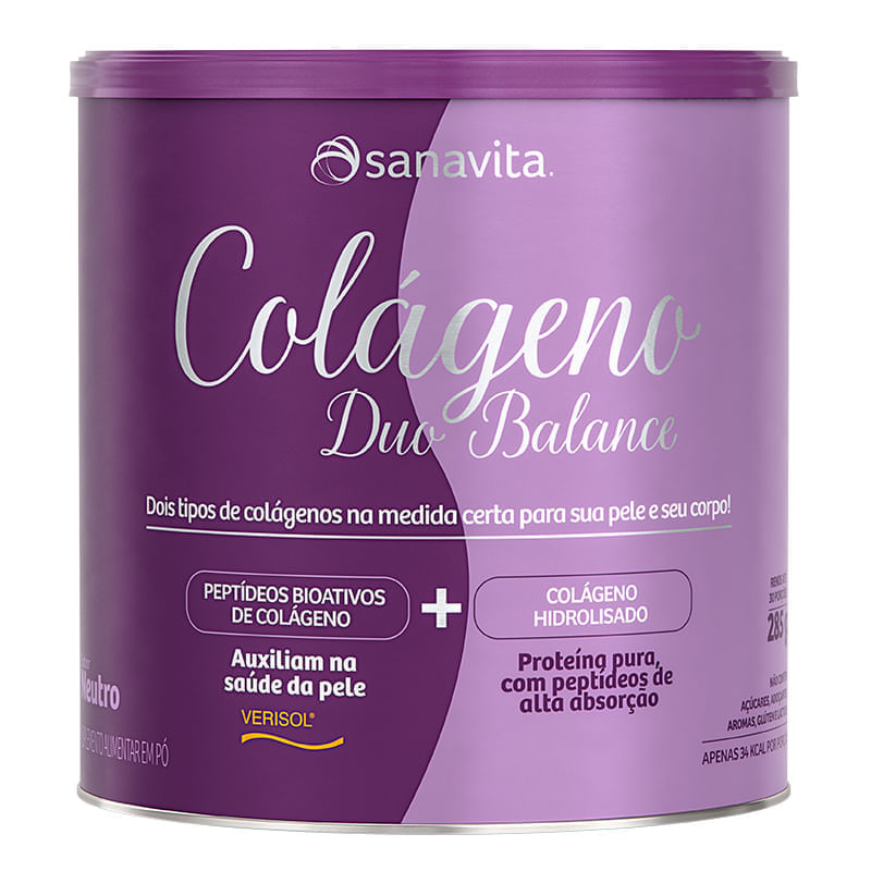 O Colágeno Duo Balance Neutro Sanavita 285g, associa em sua fórmula os dois colágenos mais recomendados na medida certa para você. Cada porção contém a dose ideal de peptídeos bioativos de colágeno Verisol® (2,5g), obtidos por processo tecnológico alemão patenteado e ação direta no tecido cutâneo, auxiliando a nutrição e saúde da pele, com resultados incríveis para a sua beleza.