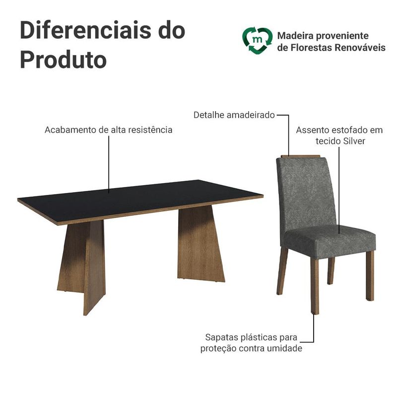 A estrutura da mesa é no acabamento amadeirado Rustic, o tampo em preto e as cadeiras revestidas em tecido Suede Silver. A combinação de tons escuros e detalhes amadeirados cria um ambiente sofisticado e atemporal, tornando o conjunto ideal para unir beleza, conforto e praticidade em sua sala de jantar.
