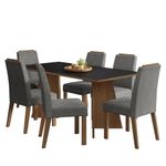 Com seis cadeiras estofadas, cada detalhe, incluindo o acabamento amadeirado no topo, proporciona elegância. A mesa, com base em formato trapézio e tampo em MDP, oferece estabilidade e amplo espaço para acomodar toda a família, tornando cada refeição ainda mais agradável.