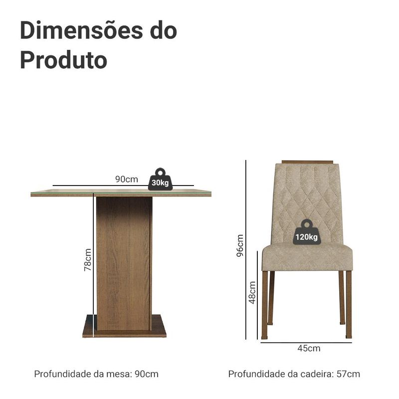Com quatro cadeiras estofadasl, cada detalhe incluindo o acabamento amadeirado no topo, oferece sofisticação e aconchego. A mesa quadrada, com base em pedestal e tampo com vidro sobreposto, proporciona estabilidade e espaço suficiente para acomodar refeições do dia a dia, tornando cada momento à mesa mais agradável.