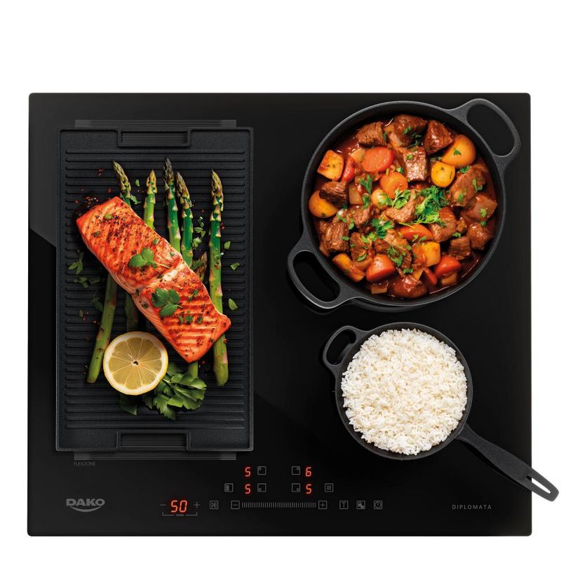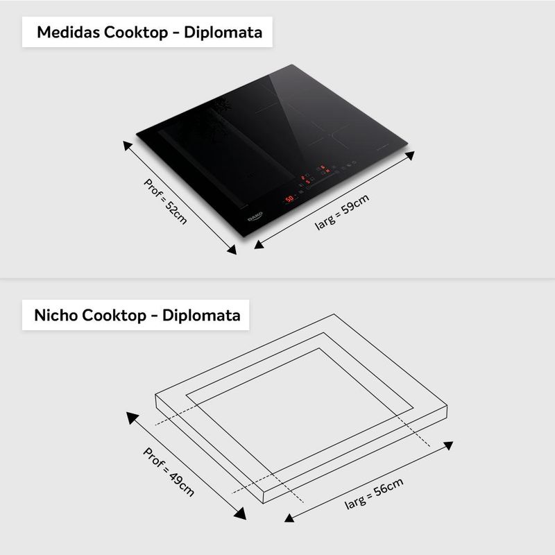 Cooktop de Indução 4 Bocas Preto com Zona Flexível Dako Diplomata 220V: desperte sua criatividade na cozinha e crie pratos incríveisO cooktop de indução Diplomata com Zona Flexível é ideal para entusiastas da tecnologia. Sua Zona Flexível se adapta a diversos tamanhos e formatos de recipientes, mantendo a eficiência e agilidade no cozimento. Com 9 níveis de potência e função turbo, oferece controle total no preparo dos alimentos, enquanto o modo Manter Aquecido ajuda a preservar a temperatura dos pratos. O Painel Touch com slide control simplifica a seleção da potência, e recursos como trava de segurança, indicador de calor residual e detector de panela garantem segurança e praticidade. Recomenda-se o uso de panelas com fundo de liga de ferro para melhor desempenho. Ficha Técnica:Fabricação: ImportadoLinha: DiplomataCor: PretoVoltagem: 220VFuncionamento: InduçãoQuantidade de Bocas: 4 bocasAcabamento da Mesa: VitrocerâmicoDimensões do Produto (largura x altura x profundidade): 59 x 6,2 x 52 cmEAN: 7897180510282Eficiência Energética: AComprimento do Cabo de Energia: 96 cmPadrão de Tomada: Circuito elétrico dedicado para o produtoGarantia12 MesesNão realizamos serviço de Instalação: Consulte nosso SAC para indicações de assistência técnica credenciada na sua região Obs: NÃO efetuamos vendas para (CNPJ) Pessoa Jurídica, somente para (CPF) Pessoa Física. Agradecemos a compreenção.