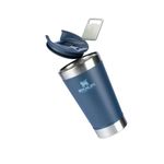 Para criar uma experiência completa, o copo térmico de cerveja da Stanley possui uma tampa contra derramamento e sujeiras, com um abridor de garrafas acoplado.