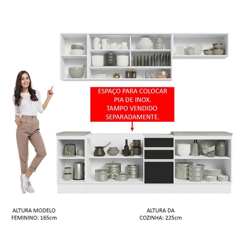 O acabamento da estrutura é branco e o das portas e frentes é preto. É feito em Pintura Poliéster ecológica com sete camadas que protegem o móvel dos efeitos da água e do calor.