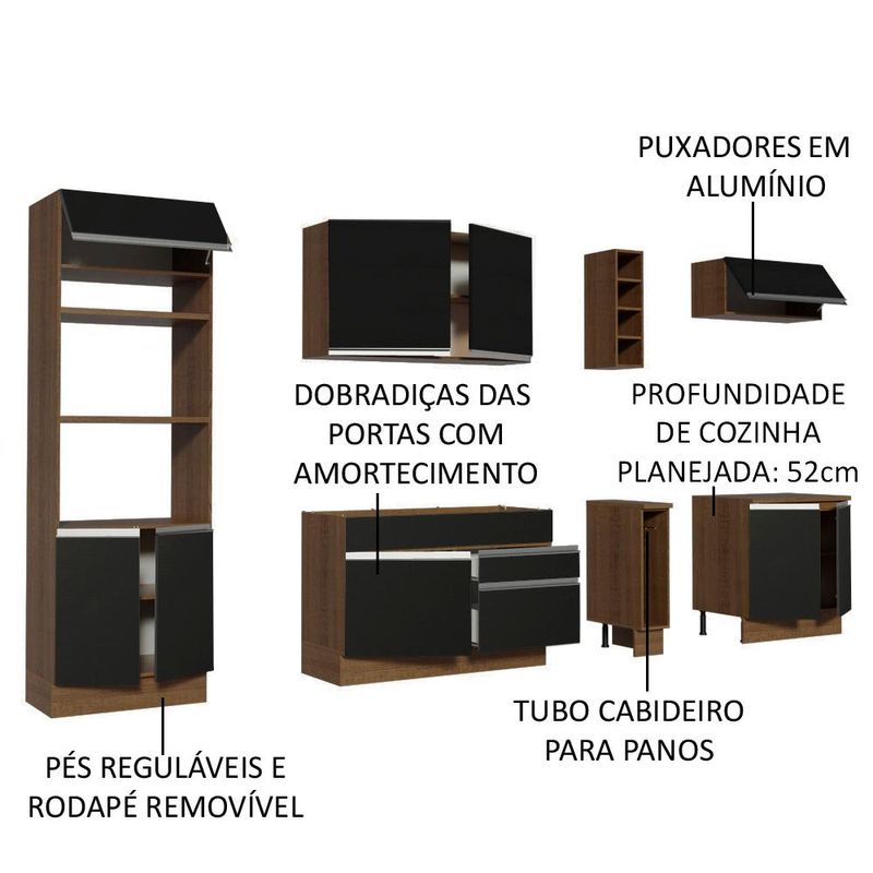 O balcão de pia comporta pias de 120 cm x 52 cm. Já o balcão para cooktop segue com tampo de 80 cm x 52 cm que pode ser recortado para a colocação do cooktop. Possui também pés reguláveis e rodapé removível. A torre possui espaço para forno e micro-ondas e permite a instalação de forno embutido.