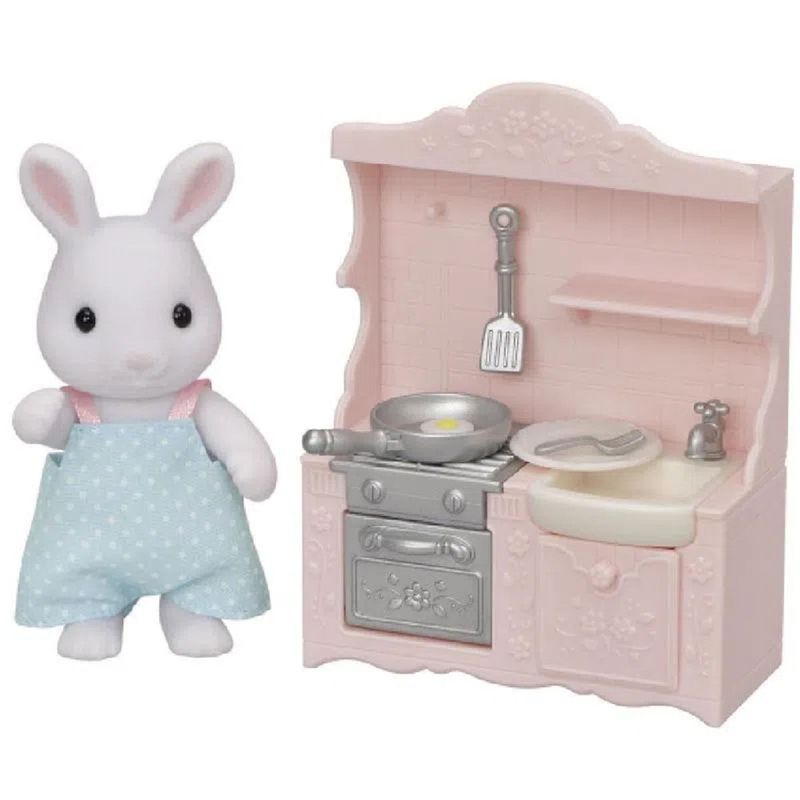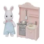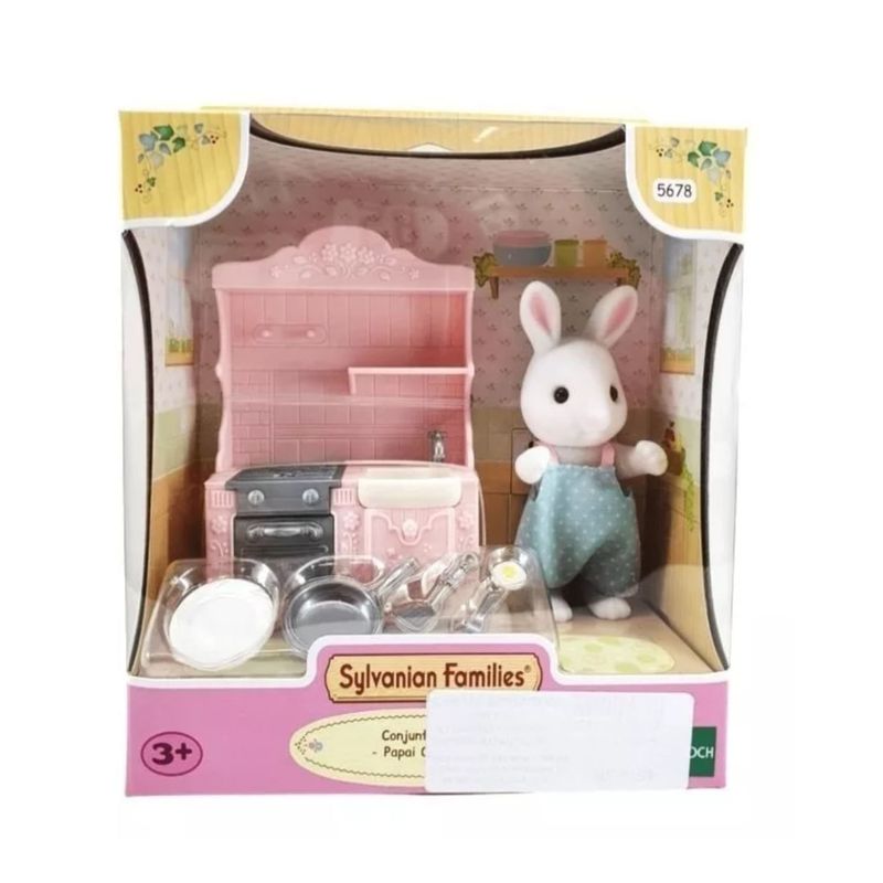 Inclui uma cozinha compacta rosa pastel, completa com pia e forno. Este conjunto também vem com pratos e outros acessórios de cozinha e pode ser usado sozinho. Apresentando o Kit Papai Coelho Neve.