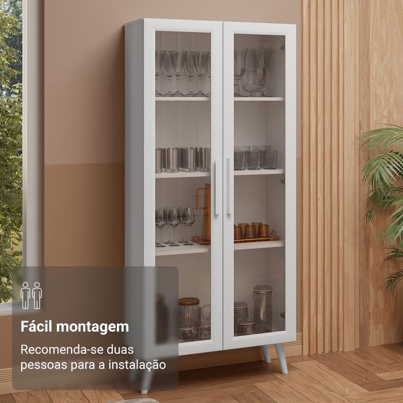 As duas portas de vidro adicionam um toque de sofisticação, permitindo que você organize e visualize suas louças, copos e demais itens decorativos. Com diversas prateleiras, a parte interna oferece um ótimo aproveitamento de espaço, ajudando a manter tudo em ordem.