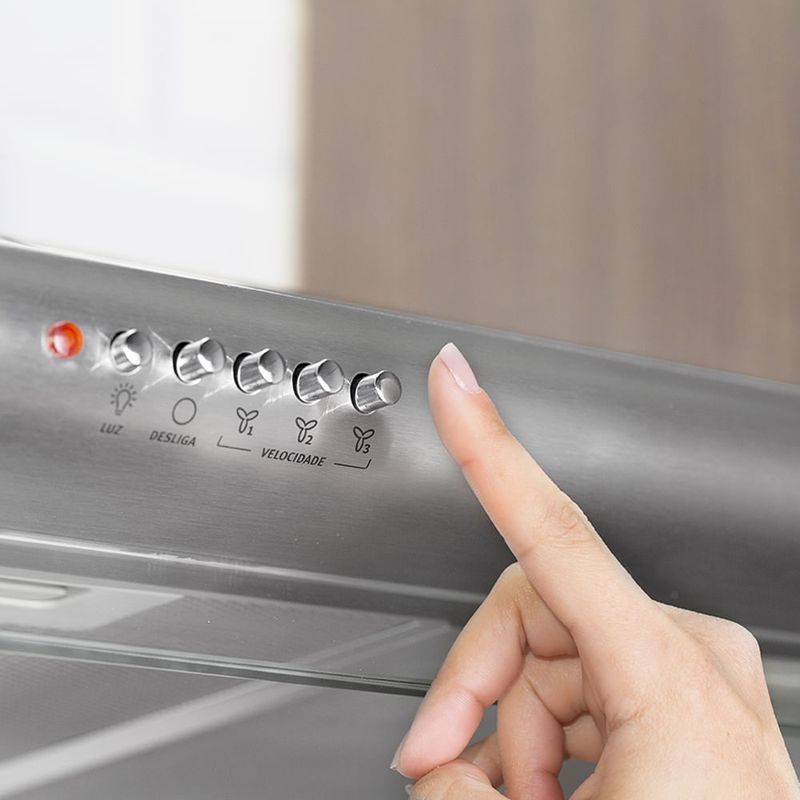 O Depurador DE80X possui um design moderno e compacto para combinar perfeitamente com o fogão. Feito em aço, é durável e fácil de limpar. Com controle por botões que permitem selecionar a velocidade desejada, o filtro metálico absorve a gordura e é facilmente lavável. Além disso, possui uma Máscara Captadora de Ar que elimina a fumaça.
