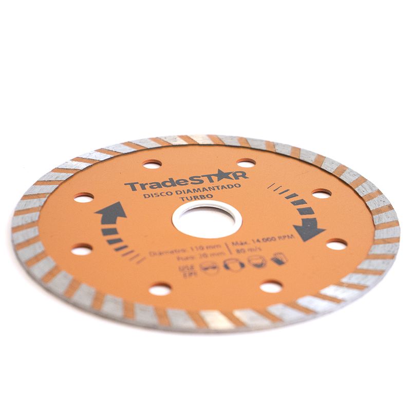 R: A durabilidade é alta devido à utilização de abrasivo de diamante sintético de qualidade, em uma estrutura de aço robusta. Características: Tipo: Disco Diamantado Turbo Material: Aço com abrasivo de diamante sintético Diâmetro Externo: 110 mm Diâmetro Interno: 20 mm Indicação: Corte de granitos, mármores, telhas e basalto Uso: Corte a seco e refrigerado Formato: Turbo Conteúdo da Embalagem: 1 Disco de Corte Diamantado Turbo 110x20 mm Tradestar Informações Adicionais: Pronta entrega – envio imediato! Emitimos nota fiscal em 100% de nossas vendas. Produto original, novo e com garantia contra defeito de fabricação. Garantia 90 dias após a compra. Observações: Imagens meramente ilustrativas. As tonalidades da cor do produto podem sofrer alterações de acordo com a tela que estiver usando para visualização. Vantagens de Comprar com a JJC Ferramentas: Experiência e Confiança: Somos especialistas em ferramentas e acessórios, garantindo produtos de qualidade e desempenho superior. Variedade e Qualidade: Oferecemos uma seleção abrangente de ferramentas, sempre priorizando a durabilidade e eficiência. Atendimento Personalizado: Nossa equipe está pronta para ajudá-lo, oferecendo suporte técnico e orientações precisas. Entrega Rápida: Garantimos uma logística eficiente, assegurando que seu pedido chegue no menor tempo possível. Satisfação Garantida: Se por algum motivo não ficar satisfeito, oferecemos política de devolução sem complicações.