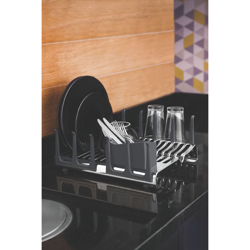 Você irá surpreender-se com o Escorredor de Louça Tramontina em Aço Inox com Secador de Copos e Porta Talheres Grafite da linha Plurale. Uma peça que proporcionará para a sua cozinha praticidade, além de beleza e modernidade com seu design inovador. Produzido em aço inox, ele é altamente durável. Além disso, conta com pés de silicone, evitando que a peça escorregue ou arranhe as superfícies, oferecendo capacidade para acomodar 16 pratos e 12 copos. O porta-talheres e porta-copos são produzidos em polipropileno, com encaixe no corpo do escorredor. O produto certo para deixar a sua cozinha mais descontraída, sem deixar de lado a funcionalidade para o dia a dia.