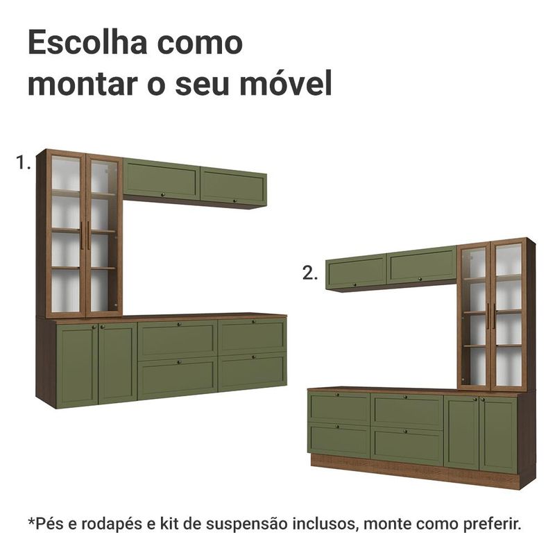 O conjunto é composto por gavetas e armários amplos, um armário com portas de vidro, que pode ser usado como cristaleira ou livreiro. Essa combinação permite acomodar uma TV, organizar livros, louças e itens decorativos com facilidade. O acabamento da estrutura é no tom amadeirado Rustic, das frentes em Verde e da cristaleira em Rustic também, possui alta resistência e textura suave ao toque.