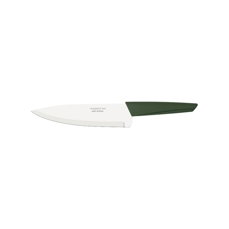 Toda a versatilidade da protagonista da cozinha: a faca chef Tramontina LYF com lâmina em aço inox e cabo de polipropileno PCR verde natureza 7 polegadas. Desenvolvida com materiais reciclados e recicláveis, ela é uma faca para o uso com os mais diversos alimentos e variados tipos de preparos. Sua lâmina é produzida em aço inox e seu cabo é em polipropileno PCR, características que garantem excelente poder de corte, alta resistência e durabilidade, além de permitir que seja levada à máquina de lavar louças. Inspirada em elementos naturais, tais como o vento e a folha, ela tem formas fluidas e é a escolha mais sustentável para sua cozinha!