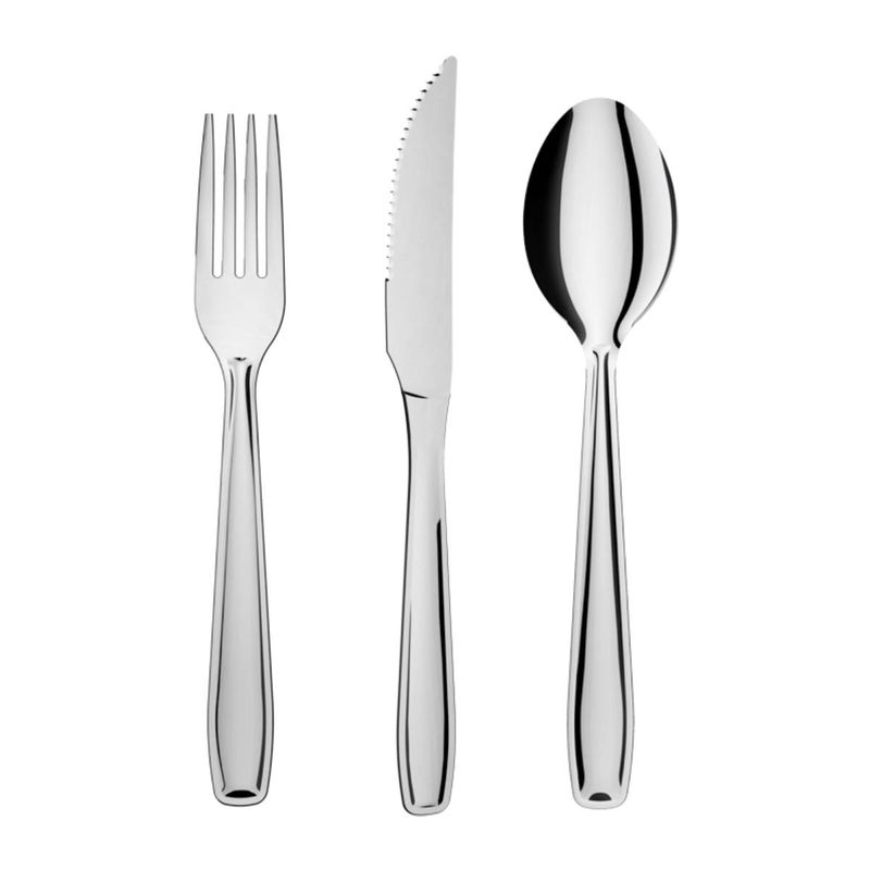 Praticidade em aço inoxidável do Faqueiro de922 peças Milano Brinox, serve 12 pessoas com colheres, garfos, facas de churrasco, colheres de sobremesa, chá e café e garfos para torta.