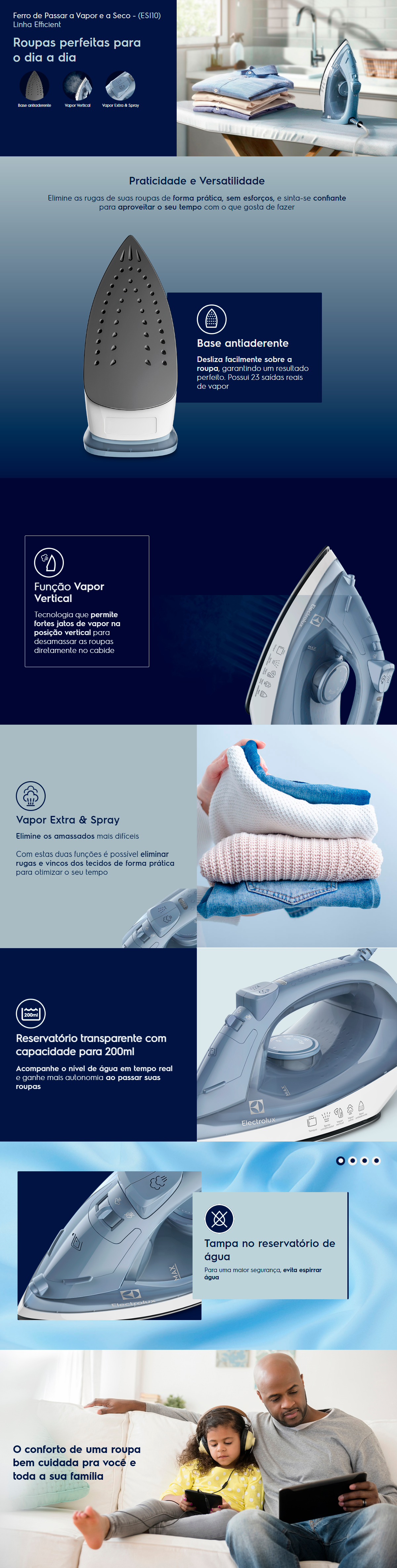 Sabia que os cuidados com as roupas vão além de uma boa lavagem? Com o Ferro de Passar à Vapor e à Seco ESI10 Electrolux, você estará sempre pronto para qualquer ocasião com suas roupas bem cuidadas.
