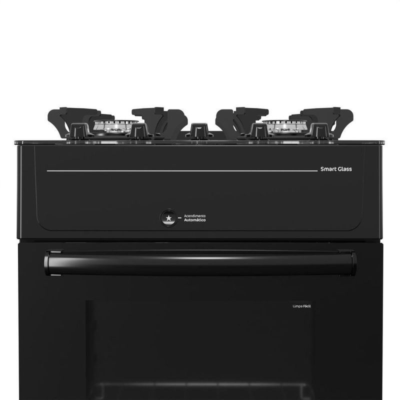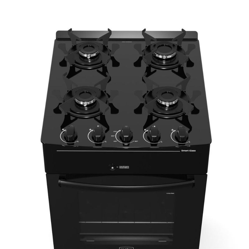 Fogão 4 Bocas A Gás Realce Smart Glass CR223 Preto BivoltA linha Smart Glass chegou para modernizar os lares pelo mundo! A mesa em vidro temperado de seis milímetros transmite segurança e deixa mais fácil a limpeza após a utilização. Além disso, possui as trempes com seis pontos de apoio, dando mais estabilidade na hora de cozinhar. Os manipuladores na mesa tornam o momento de cozinhar ainda mais fácil, e o seu queimador central mega chama torna o cozimento ainda mais rápido. Esse produto possui o forno 100% esmaltado, sendo o maior forno da categoria, com incríveis 50 litros de capacidade. Para finalizar, este fogão dispõe de acendimento automático na mesa e forno.Conteúdo da Embalagem:
