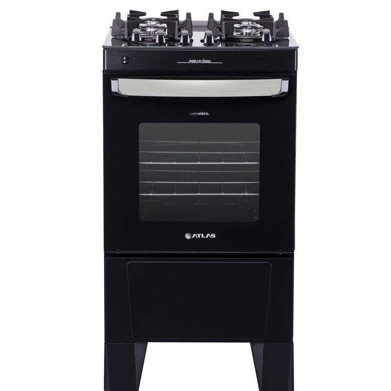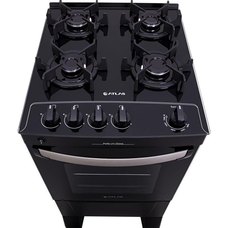 Fogão 4 Bocas Atlas Agile UP Glass Com Mesa De Vidro E Acendimento Automatico Preto BivoltAlém da mesa de vidro temperado com borda infinita e top control, o fogão ainda conta com botões removíveis, trempes de ferro fundido com 6 pontos de apoio, acendimento automático, puxador ergonômico em alumínio escovado e pés altos e robustos.-Controle de temperatura simples e ágil (180º C a 290º C)-A versão 4 bocas possui 2 queimadores de 1,7kW e 2 queimadores Família de 2,0kW