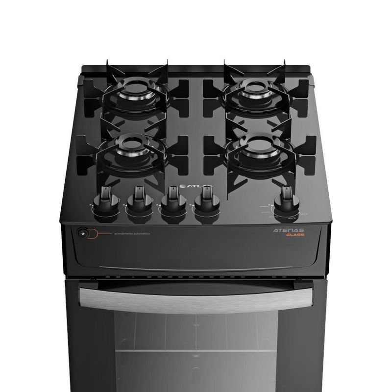 Fogão 4 Bocas Atlas Atenas Glass Mesa de Vidro Preto BivoltO lançamento Atlas Atenas Glass une design sofisticado com desempenho funcional. Com mesa de vidro temperado sem bordas, o modelo oferece excelente acabamento, além de grades individuais de aço esmaltado com 6 pontos de apoio, proporcionando maior estabilidade para suas panelas.Conta ainda com acendimento automático, puxador amplo em alumínio escovado, botões removíveis e pés altos e robustos, que facilitam na hora da limpeza.Queimadores potentes e eficientes: