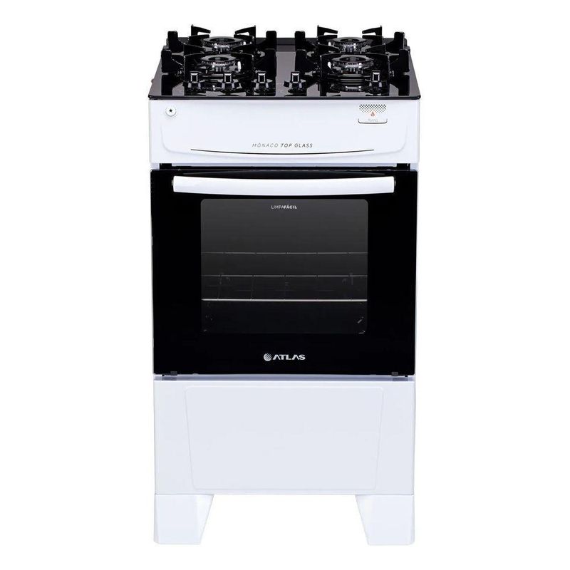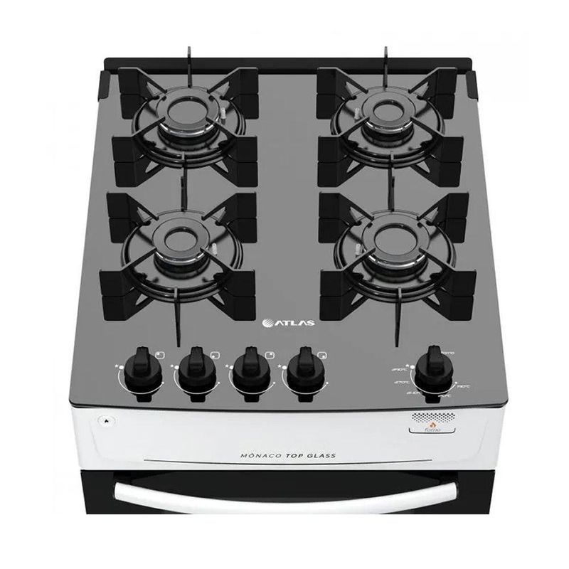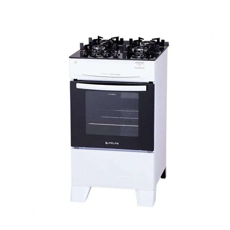 Fogão 4 Bocas Atlas Mônaco Top Glass Acendimento Automático BrancoO Fogão Mônaco Top Glass da Atlas Eletrodomésticos oferece beleza e praticidade para sua cozinha. Com uma mesa de vidro temperado, é resistente e fácil de limpar, trazendo um toque moderno para o ambiente.As grades com seis pontos de apoio garantem que suas panelas fiquem estáveis durante o preparo das refeições. Os pés robustos e altos facilitam a limpeza do chão ao redor do fogão.O forno possui uma grade deslizante, puxador em aço e acabamento Limpa Fácil, promovendo sofisticação e praticidade.Características