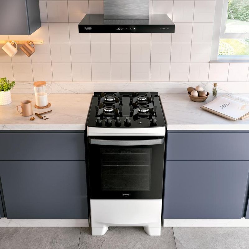 Os tempos mudaram e o Supreme Glass também. Ele continua compacto por fora e gigante por dentro. Afinal, até os sucessos merecem ser reinventados.Tenha mais agilidade no preparo das refeições com a praticidade que você merece. Moderno, seguro e eficiente, o fogão Dako Supreme Glass é perfeito para todos os estilos de cozinha. A versão de 4 bocas conta com queimadores potentes, enquanto as **grades individuais de ferro fundido** com 6 pontos de apoio, garantem aderência e estabilidade para suas panelas.O **puxador em alumínio escovado**, além de ergonômico, dá um toque a mais de sofisticação no design. A **prateleira deslizante** torna ainda mais fácil colocar e retirar suas receitas com total praticidade. O **visor amplo** do forno permite acompanhar o preparo sem precisar abrir a porta, e o acabamento **Limpa Fácil** deixa a limpeza ainda mais rápida e descomplicada.Ter um Fogão Dako Supreme Glass é transformar a cozinha no coração da sua casa. É sentir o prazer de preparar refeições deliciosas com a confiança de estar utilizando um fogão que alia qualidade e inovação.Poucas coisas funcionam tão bem quanto um Fogão Dako Supreme Glass.Você vai perceber: na hora de comprar, a Dako surpreende!Confira demais características do produto:Voltagem: Bivolt