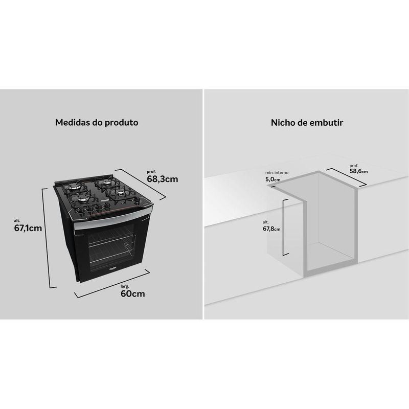 Fogão 4 Bocas De Embutir Dako Diplomata Com Mesa De Vidro Preto BivoltO Fogão de Embutir Diplomata é perfeito para quem busca uma experiência completa na hora de cozinhar. Design e sofisticação combinados com recursos pensados para todos os tipos de receita.Suas grades de ferro fundido com 8 pontos de apoio são sinônimo de robustez e total estabilidade das suas panelas. Com o puxador de alumínio escovado e a mesa ultra resistente em vidro temperado, a limpeza também fica prática.Cozinhe o que quiser e para quantas pessoas desejar, pois o forno do Diplomata é o maior da categoria, com 82,5 litros.Quer mais? Também possui uma visão ampla, que permite enxergar tudo o que tem dentro do forno, vidro duplo temperado sendo o interno removível, e revestimento Limpa Fácil, para facilitar ainda mais na hora da limpeza.Pensou qualidade alinhada à sofisticação, pensou Diplomata!