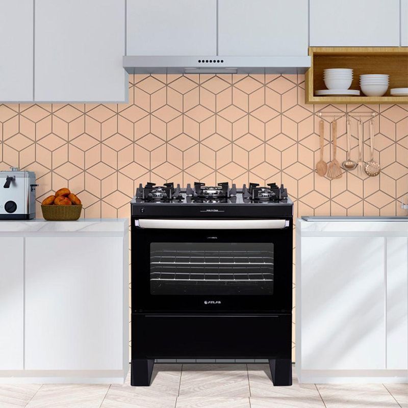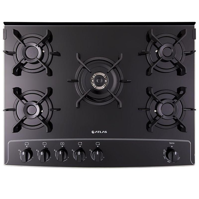 Fogão 5 Bocas Atlas Agile UP Glass Com Mesa De Vidro E Acendimento Automatico Preto BivoltAlém da mesa de vidro temperado com borda infinita e top control, o fogão ainda conta com botões removíveis, trempes de ferro fundido com 6 pontos de apoio, acendimento automático, puxador ergonômico em alumínio escovado e pés altos e robustos.-Grades do Forno 2 Grades deslizantes-A versão 5 bocas possui 2 queimadores de 1,7kW, 2 queimadores Família de 2,0kW e 1 queimador Tripla Chama de 3,3kW