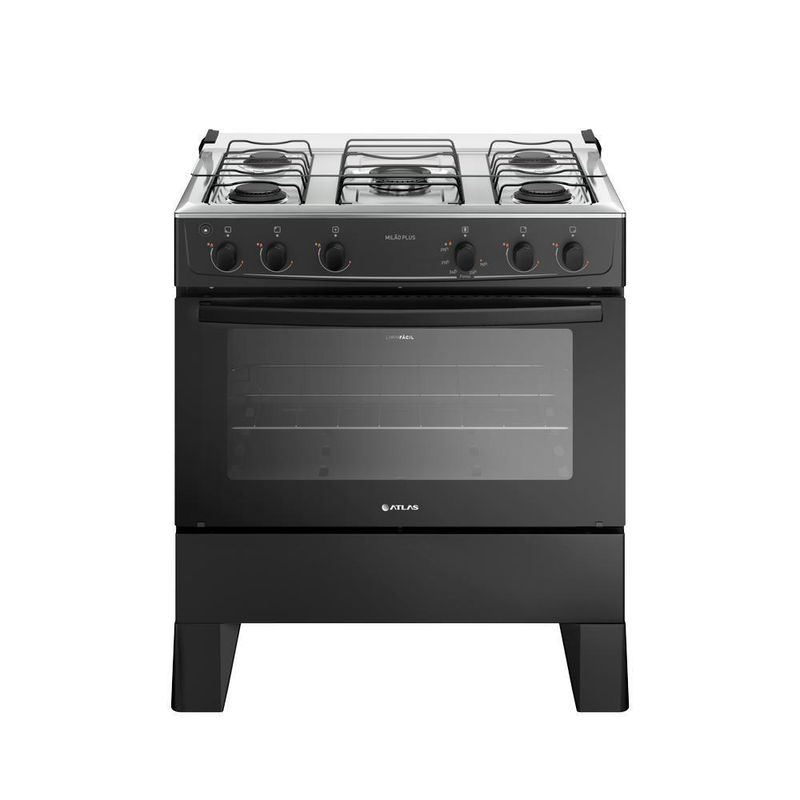 Fogão 5 Bocas Atlas Milão Plus Preto Com Mesa De Inox A Gás BivoltO Fogão Atlas Milão Plus é prático, fácil de limpar e bonito, ideal para sua cozinha! A tampa de vidro protege contra respingos, mantendo a cozinha organizada. Chega montado e pronto para uso, com acendimento girou, clicou, acendeu, dispensando fósforos. Seus pés altos facilitam a limpeza, e sua estrutura firme garante durabilidade. Os queimadores e o forno Limpa Fácil são esmaltados, facilitando a limpeza. A versão com 5 bocas inclui um queimador megachama.Transforme sua cozinha com o Fogão Atlas Milão Plus!