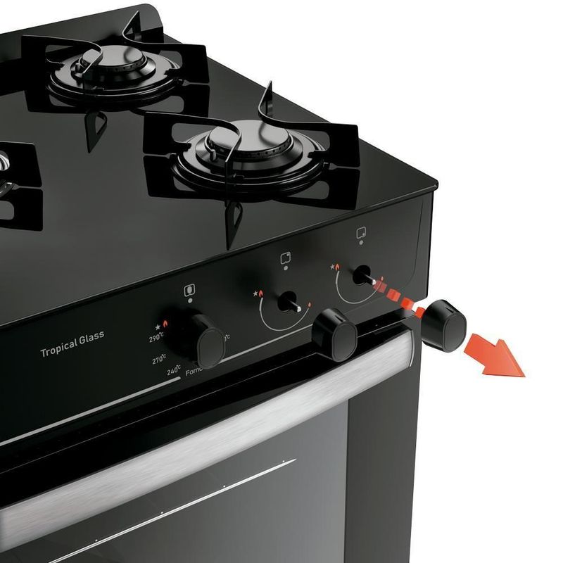 Prateleira do Forno: 1 deslizante para facilitar o uso.É um modelo robusto, ideal para quem busca um fogão eficiente e de fácil manutenção, com uma estética moderna e prática para o dia a dia.