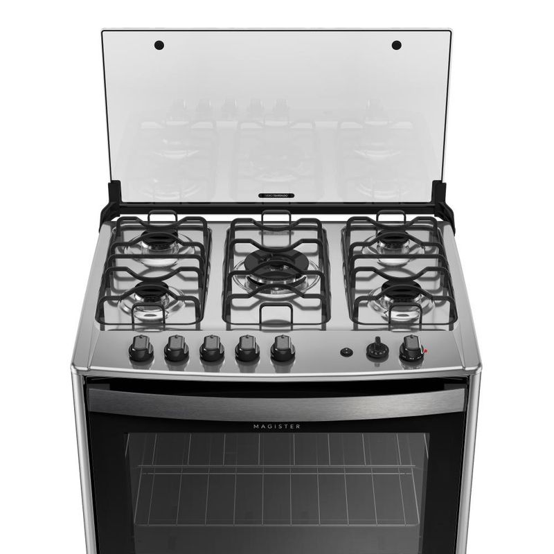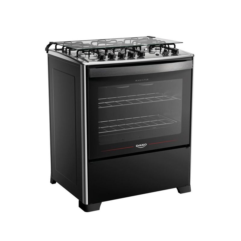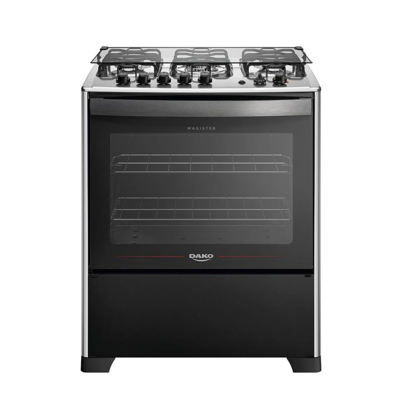 O Magister Grill Inox é um fogão sofisticado, ideal para quem valoriza design moderno e recursos avançados.Seu visual elegante se destaca pela porta de vidro, cantoneiras em inox e puxador de alumínio escovado, proporcionando um toque luxuoso.Possui acendimento fácil “girou, clicou e acendeu”, facilitando o preparo rápido de receitas. O forno espaçoso vem com duas prateleiras, uma auto deslizante e outra deslizante, além da função Grill para dourar e grelhar. As grades duplas de pitatina garantem robustez e segurança ao movimentar panelas. Ambas as versões incluem timer, completando a gama de funcionalidades desse produto. Atributos e Benefícios:Design que transforma: Frente toda em vidro com cantoneiras em inox e puxador de alumínio escovado, um visual moderno que valoriza sua cozinha.Acabamento de chef: Função Grill para dourar e grelhar os alimentos, garantindo um toque profissional às suas receitas.Precisão em cada minuto: Timer com aviso sonoro para que você nunca mais erre o ponto dos seus pratos.Cozinha com estabilidade: Grades duplas de piatina que garantem máxima firmeza e segurança ao movimentar as panelas.Potência que surpreende: Versão 5 bocas com a potência da Tripla Chama, ideal para grandes receitas.Praticidade que inspira: Duas prateleiras no forno, uma autodeslizante para facilitar a retirada dos pratos e outra com altura ajustável para maior versatilidade.Economia para o seu dia a dia: Isolamento térmico com lã de basalto que preserva o calor, otimizando a temperatura e reduzindo o consumo de gás.Limpeza sem esforço: Acabamento Limpa Fácil que simplifica a limpeza e a manutenção da sua cozinha. Ficha Técnica: Marca: Dako