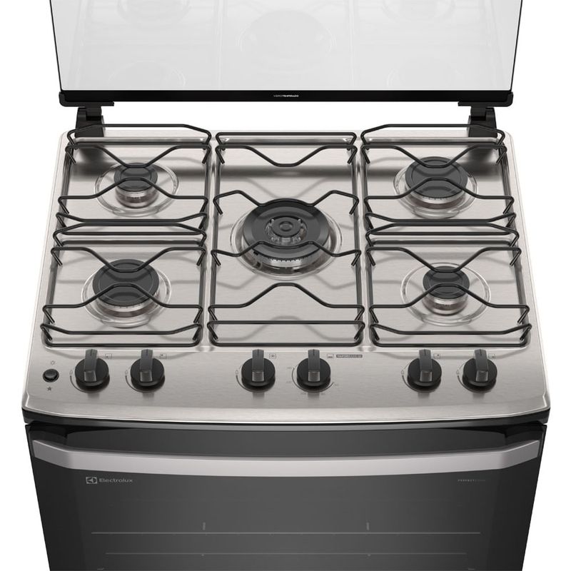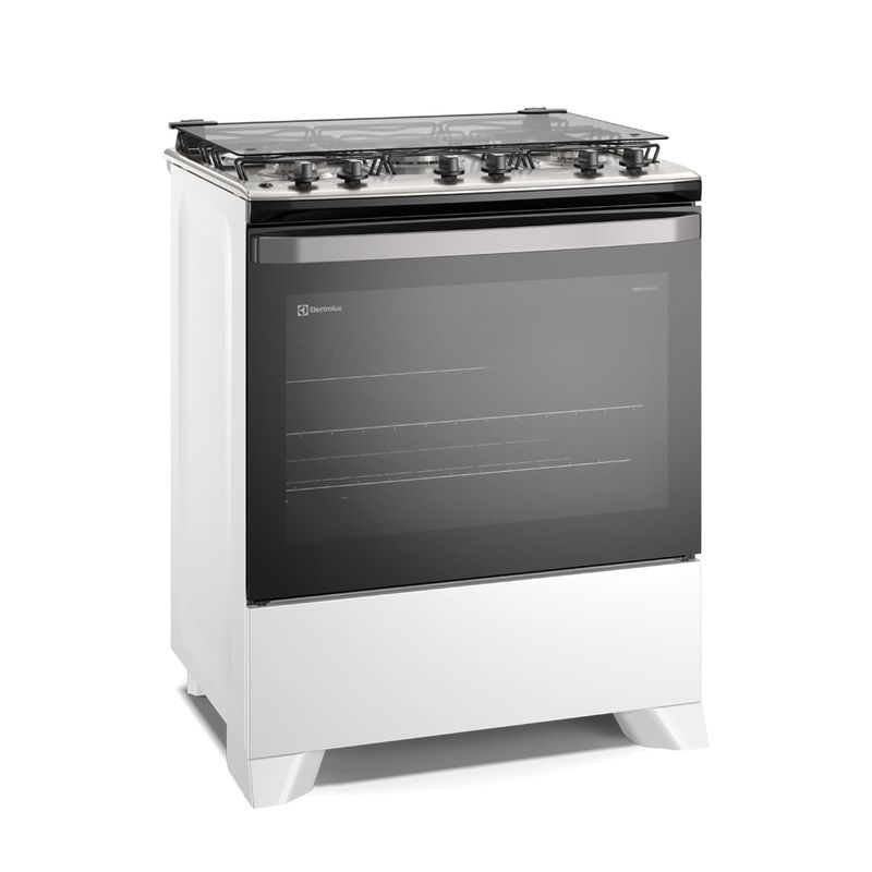 Tecnologias do fogão de 5 bocas branco com mesa inox As tecnologias do fogão 5 bocas Electrolux são ideais para uma performance eficiente e preparos saborosos, resultando em alimentos com a textura perfeita. PerfectCook (Cavidade Selada): maior controle de temperatura com menos perda de calor, reduzindo o tempo de cozimento de alimentos, por meio de uma estrutura com catnso arredondados; VaporBake®: cozimento a vapor que mantém a aparência e melhora a crocância, textura e sabor em massas e pães; Regenerar a Vapor: reaqueça seus pratos com vapor e preserve o sabor e aroma dos alimentos sem ressecá-los; Tripla Chama: mais potência e velocidade no preparo de suas receitas. Deixa as receitas mais homogêneas e saborosas; Mesa de Inox Compartimentada: design robusto e compartimentado que evita que líquidos escorram pela superfície do produto, permitindo uma limpeza profunda do fogão sem esforço; Capacidade do Forno e Porta Inteira em Vidro: maior espaço interno e melhor visibilidade do interior do forno para acompanhar o preparo de suas receitas sem necessidade de abrir a porta; Vidro interno do forno removível: remova o vidro interno do forno com facilidade para uma limpeza completa e sem esforço; FastClean: forno com revestimento que impede a penetração de sujeira e permite maior facilidade na remoção de gorduras e manchas, além de cantos arredondados e sem frestas que facilitam a limpeza no dia a dia, com 2 anos de garantia; Forno com 2 prateleiras: uma prateleira manual e outra auto deslizante, que facilitam a retirada dos alimentos do forno com praticidade e segurança; Queimadores selados e botões removíveis: bocas seladas e botões removíveis para menos esforço na limpeza do fogão; Grades individuais: mais fáceis e práticas de limpar; Acendimento Automático: acendimento com ignição rápida, fácil e segura; Luz no forno: acompanha lâmpada que facilita a visualização interna do forno.