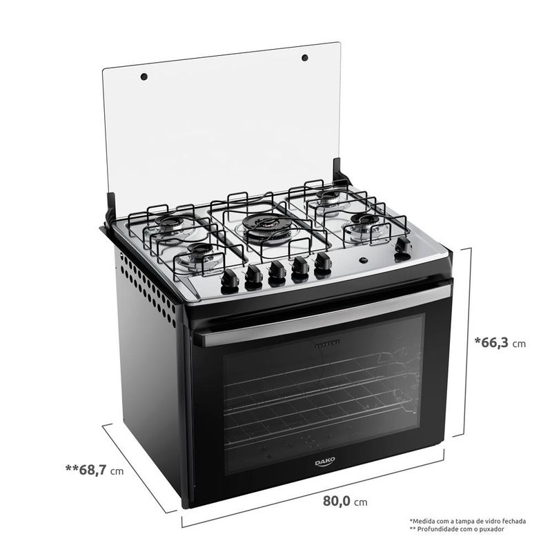 O Fogão de Embutir 5 Bocas Dako Supreme vai além do básico e se torna seu parceiro na cozinha. Seja na correria do café da manhã ou no preparo de um jantar especial, ele está pronto para atender suas receitas e garantir o ponto perfeito em cada uma delas.Imagine um fogão que combina design moderno com puxador em alumínio escovado, trazendo elegância para sua cozinha, enquanto a resistente mesa em inox oferece a robustez que você precisa no dia a dia.Com a Tripla Chama, você tem a liberdade de cozinhar do seu jeito: desde preparos rápidos e intensos até receitas que exigem cuidado e temperatura baixa.O forno de 100 litros é um verdadeiro aliado para quem gosta de receber amigos e família - imagine assar uma lasanha familiar e uma torta de sobremesa ao mesmo tempo! De quebra, o visor amplo e a luz interna permitem que você acompanhe tudo sem abrir a porta, mantendo o calor ideal e garantindo resultados perfeitos.Ah, e as grades duplas de arame? Além de super estáveis, não deixam a sujeira grudar, facilitando sua vida na hora da limpeza. E para completar, o fogão ainda vem com botões removíveis, acendimento automático e forno limpa fácil. Tudo para tornar sua experiência na cozinha ainda mais prática.Transforme sua cozinha e suas receitas com o Fogão de Embutir 5 Bocas Dako Supreme. Porque toda refeição merece um toque especial, e toda cozinha merece um Dako. Atributos e benefícios- Tripla Chama: Proporciona mais velocidade no preparo, garantindo cozimento rápido e eficiente.