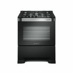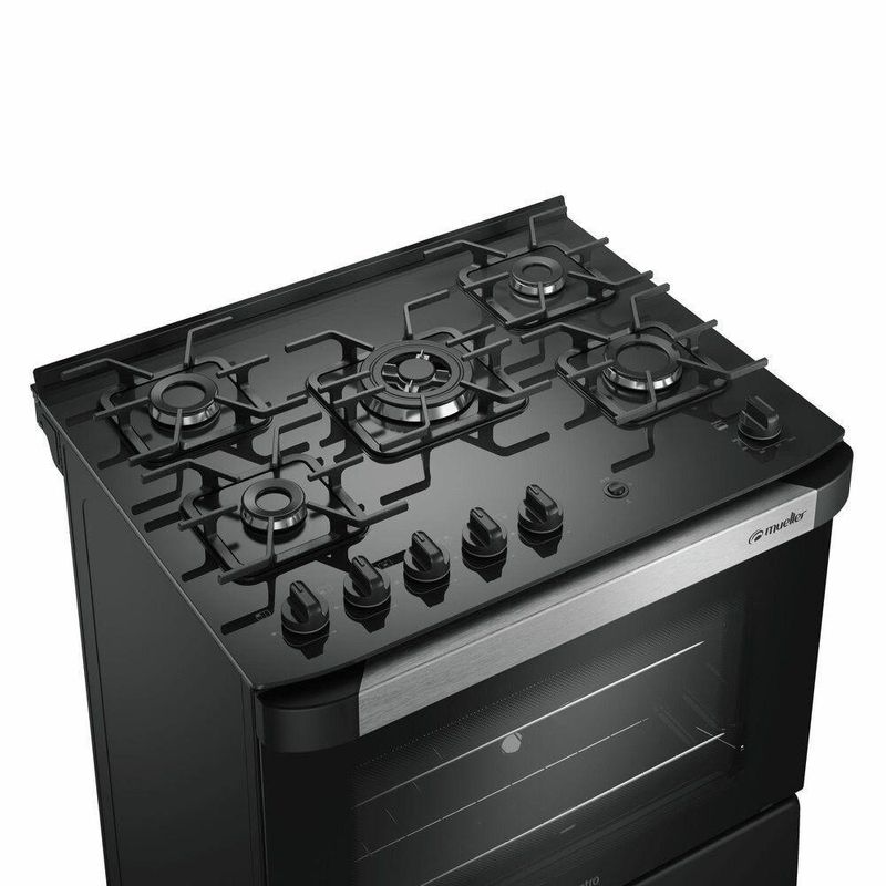 Fogão A Gás De Piso Decorato Vetro G3 5 Bocas Mueller Preto Fosco BivoltFogão a Gás de Piso Decorato Vetro G3 5 Bocas Mesa de Vidro MuellerCom acabamento sofisticado, o Fogão a Gás de Piso Decorato Vetro G3 5 Bocas Mesa de Vidro Mueller é a opção perfeita para quem busca beleza e praticidade. Ele possui mesa de vidro temperado, moderna e fácil de limpar, puxador de alumínio escovado e grades de ferro fundido que facilitam o movimento das panelas. Além disso, conta com queimadores de diferentes potências e grades em 6 pontos, garantindo mais estabilidade e segurança. O forno é equipado com prateleira de altura ajustável e uma prateleira deslizante, além de uma porta de forno com vidro removível.Características:Marca: Mueller