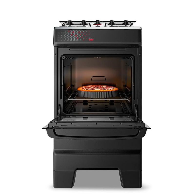 Diferenciais do Produto:Mesa de Inox com Tampa de Vidro: A mesa em aço inox oferece durabilidade e é muito fácil de limpar, enquanto a tampa de vidro temperado protege a parede contra respingos e adiciona um toque de elegância.Trempes Duplas para Maior Estabilidade: As grades duplas proporcionam mais pontos de apoio, garantindo estabilidade e segurança superiores, mesmo para panelas maiores ou mais pesadas.Forno de 50L com Visão Ampla: O forno de boa capacidade conta com porta de vidro total e vidro interno removível, o que facilita a visualização dos pratos e a higienização completa.Praticidade e Segurança no Uso: Possui acendimento automático para mais agilidade, puxador ergonômico e botões removíveis que simplificam a limpeza.Design Inteligente: Os pés altos e retos facilitam a limpeza do piso abaixo do fogão, e a prateleira ajustável no forno oferece mais flexibilidade para suas receitas.