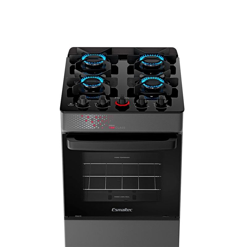 O que você precisa saber sobre este produtoAcendimento automático: mais agilidade no preparoMesa de vidro temperado: design sofisticado, resistente e fácil de limparTrempes individuais com 6 apoios: mais estabilidade e segurança no preparoForno Limpa Fácil com 50 litros de capacidade: ideal para o preparo do dia a diaPorta do forno em vidro total com vidro interno removível: mais praticidade na limpezaPuxador ergonômico: conforto ao toque e durabilidadePés altos e retos com encaixe fácil: mais estabilidade e segurança.O Fogão 4 Bocas Esmaltec Ideal Top Glass a Gás com Mesa de Vidro Titanium traz sofisticação e modernidade para quem busca um fogão eficiente com visual marcante.A mesa de vidro temperado oferece brilho, resistência e fácil limpeza, ideal para quem valoriza estilo e funcionalidade.O acendimento automático torna o uso mais prático.As trempes individuais com 6 apoios garantem mais estabilidade e segurança, mesmo em receitas com panelas maiores.O forno com 50 litros de capacidade, com porta em vidro total, vidro interno removível e prateleira ajustável, proporciona versatilidade para o preparo e praticidade na hora da limpeza.O modelo ainda conta com puxador ergonômico e pés altos e retos com encaixe fácil, entregando mais conforto e segurança no uso diário.O Esmaltec Ideal Top Glass 4 bocas Titanium a gás é ideal para quem busca performance, design premium e uma cozinha com personalidade.Isso é valor.Isso é Esmaltec.