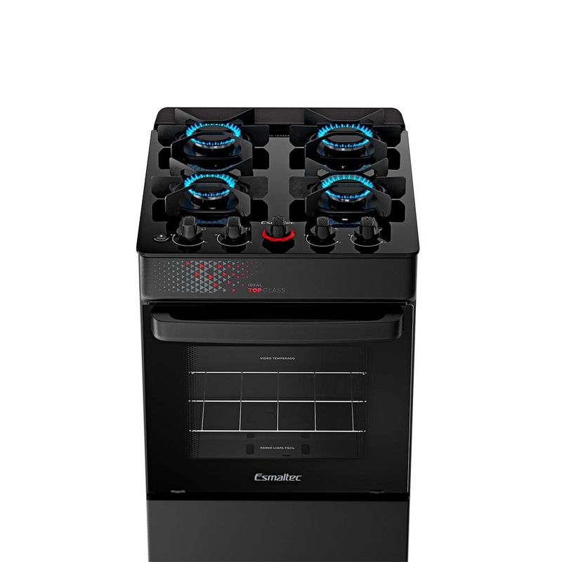 Pés altos e retos com encaixe fácil: mais estabilidade e segurançaDescriçãoO Fogão 4 Bocas Esmaltec Ideal Top Glass a Gás com Mesa de Vidro Preto é perfeito para quem busca um visual moderno aliado à praticidade no dia a dia. A mesa de vidro temperado destaca-se pelo acabamento brilhante, fácil limpeza e excelente resistência.Com acendimento automático, o fogão é mais prático no uso diário. As trempes individuais com 6 apoios oferecem mais firmeza para as panelas, garantindo segurança mesmo em preparos mais intensos.O forno com 50 litros de capacidade, com porta em vidro total, vidro interno removível e prateleira ajustável, permite flexibilidade no preparo de receitas e mais facilidade na higienização.Além disso, o modelo traz puxador ergonômico e pés altos e retos com encaixe fácil, que agregam conforto, estabilidade e funcionalidade no uso cotidiano.O Esmaltec Ideal Top Glass 4 bocas preto a gás é ideal para quem valoriza performance com design sofisticado.Isso é valor. Isso é Esmaltec.